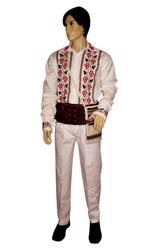 Camasa de baietei compus din camasa traditional romaneasca din panza alba de bumbac brodata manual cu motive florale albastru inchis si deschis, cu guler normal , siret la gat si manseta.