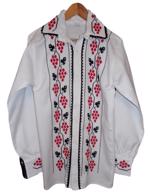 Camasa din panza de bumbac subtire, albinita alba, cusuta manual cu fir de pna rosu si negru.