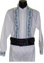 camasa baietei traditional romaneasca din panza de bumbac brodata manual cu motive populare albastru si bleu, cu guler normal, siret la gat si maneca larga.