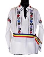 camasa baietei traditional romaneasca din panza de bumbac brodata manual cu motive florale rosu, galben, albastru , mov si negru, cu guler normal, siret la gat si maneca larga.