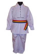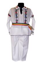 camasa baietei traditional romaneasca din panza de bumbac brodata manual cu motive populare lila si verde, cu guler normal , siret la gat si manseta, pantaloni albi din doc si brau tricolor.
