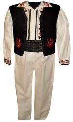 camasa baietei traditional romaneasca din panza de bumbac brodata manual cu motive florale negru, cu guler normal , siret la gat si maneca larga, pantaloni din doc alb si brau tesut tricolor.