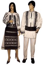 Costum popular de baieti format din camasa din panza de bbc cu in cusuta manual cu model cu struguri albastru inchis cu bleu, pantaloni din doc alb si brau tricolor.