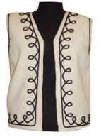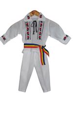 Costum popular de botez format din camasa bebelusi traditional romaneasca din panza de bumbac brodata manual cu trandafiri albastri cu bleu , cu guler, nasturi si insertie de dantela alba pe langa nasturi, guler si la manseta , pantaloni albi din doc ,brau tricolor si vesta din stofa natur cu dantela neagra.