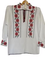 Camasa din panza de bumbac gros ( matador) alba, cusuta manual cu fir mov si negru.