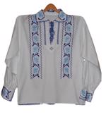 Camasa din panza de bumbac gros ( matador) alba, cusuta manual cu fir portocaliu, verde si negru.