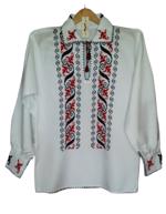 Camasa din panza de bumbac gros ( matador) alba, cusuta manual cu fir bleu si negru.
