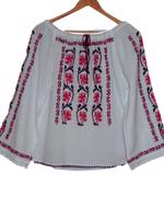 Această cămașă populară tradițională pentru bărbați este realizată din pânză albă de bumbac de înaltă calitate, cusută manual cu mare atenție la detalii. Modelul cusut manual pe această cămașă prezintă motive traditionale cu rosu si negru, creând un design deosebit și unic.
