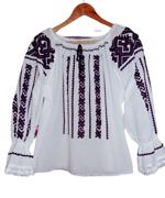 Camasa barbati traditional romaneasca din panza de bumbac brodata manual cu motive populare de culoare rosu si negru, cu guler normal , siret la gat si maneca lunga dreapta.