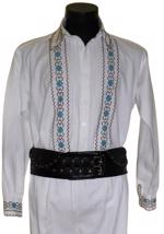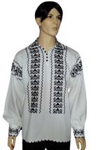 Camasa traditional romaneasca din panza de bumbac brodata manual cu motive geometrice rosu cu negru , cu guler normal, maneca lunga .