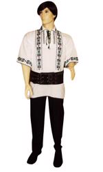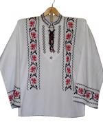 Camasa populara barbati din panza groasa de bumbac (vezi foto in tabel de masuri) brodata manual cu motive florale cu negru si albastru deschis, cu guler normal si maneca lunga cu manseta si insertie de dantela neagra la guler, maneci si si pe langa nasturi.