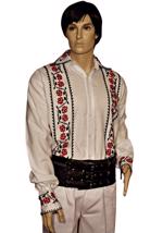 Camasa barbati traditional romaneasca din panza de bumbac brodata manual cu motive geometrice cu negru si maro, cu guler normal, siret si manseta.