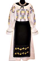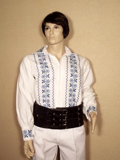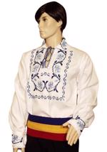 Camasa populara barbati din panza groasa de bumbac (vezi foto in tabel de masuri) brodata manual cu motive florale albastru inchis si albastru deschis, cu guler normal si maneca lunga cu manseta si insertie de dantela alba la guler, maneci si pe langa nasturi.