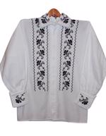 Camasa populara barbati din panza groasa de bumbac (vezi foto in tabel de masuri) brodata manual cu motive traditionale cu negru, cu guler tip tunica si maneca lunga cu manseta ingusta ,maneci si pe langa nasturi.