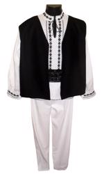 Costum popular fomat din camasa traditional romaneasca brodata manual cu motive populare rosu cu negru, pantaloni din doc alb si chimir din piele neagra pe 3 catarame