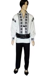 Costum popular de barbati format din camasa traditional romanesca din panza alba de bumbac gros, matador, cusuta manual cu fir rosu, albastru si negru, pantaloni albi din doc si chimir negru din piele pe 3 catarame. 100% cusute manual Pentru pantaloni, trimiteti dimensiunile conform ghid de masura. Pentru chimir, trimiteti masura din talie, in centimetri.