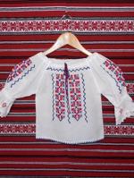 Cămașă tradițională pentru bărbați cu motive traditionale roșii , galbene, verzi si negre - cusută manual pe panza albă de bumbac