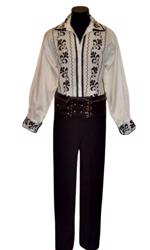 Costum popular barbati format din camasa din panza de bumbac alba cusuta manual cu motive florale cu negru si bleu, pantaloni din doc alb, si chimir negru din piele pe 3 catarame.