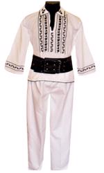 camasa barbati traditional romaneasca din panza de bumbac brodata manual cu motive florale cu negru , cu guler normal,nasturi, insertie de dantela neagra pe langa nasturi, guler si la manseta, pantaloni albi din doc si brau din piele pe 3 catarame..