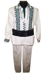 camasa barbati traditional romaneasca din panza de bumbac brodata manual cu motive geometrice de culaore neagra , cu guler tunica si manseta, pantaloni albi din doc si elastan mulati pe picior numiti cioareci si brau din piele pe 3 catarame negru.