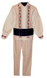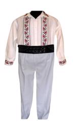 camasa barbati traditional romaneasca din panza de bumbac brodata manual cu motive geometricei rosu cu negru , cu guler normal, nasturi insertie de dantela neagra pe langa nasturi, guler si la manseta , pantaloni albi din doc si brau din piele pe 2 catarame.