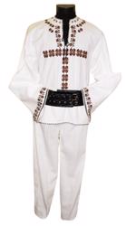 camasa barbati traditional romaneasca din panza de bumbac brodata manual cu motive geometrice cu negru, cu guler normal,siret la gat si manseta, pantaloni albi din doc si vesta din stofa neagra.