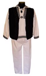 camasa barbati traditional romaneasca din panza de bumbac brodata manual cu motive populare cu negru, cu guler normal si manseta , pantaloni din doc alb si brau tesut cu matase alba.