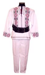 Costum popular de barbati format din camasa traditional romaneasca din panza alba de bumbac brodata manual cu fir negru, pantaloni din doc alb si chimir din piele neagra pe 3 catarame.