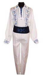 Costum popular format din camasa populara de barbati cusuta manual cu motive florale cu negru, pantaloni din doc negru si chimir din piele neagra.