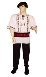 Costum popular format din camasa traditionala de barbati din panza alba de bumbac brodata manual cu motive florale albastru si negru, pantaloni (cioareci) din bumbac cu elastan albi si chimir din piele neagra pe 3 catarame.
