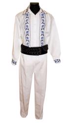 Costum popular barbati format din camasa traditional romaneasca din panza alba de bumbac brodata manual cu motive florale cu fir negru, cu guler si 2 nasturi la gat si maneca larga, pantaloni albi din bumbac si chimir din piele neagra pe 3 catarame.