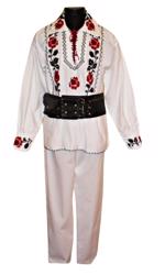 camasa barbati traditional romaneasca din panza de bumbac brodata manual cu motive geometrice negre , cu guler tunica, siret la gat, maneca larga si insertie de dantela la maneca, pantaloni albi din doc si brau din piele pe 3 catarame.