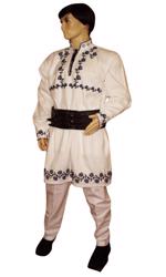 camasa barbati traditional romaneasca din panza de bumbac brodata manual cu crini albastru si bleu , cu guler normal, nasturi si manseta, pantaloni albi din doc.