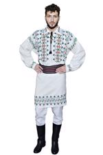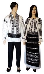 Costum popular de cuplu format din  format din ie traditional romaneasca din panza subtire de bumbac brodata manual cu motive populare cu fir negru cu maneca lunga ce se termina cu insertie de dantela alba si elastic, poale(fusta) alba din panza de bumbac cu insertie de dantela alba pe margini,  2 catrinte(fote) de 100 cm lungime , fata-spate, tesute in razboi din lana neagra si motive populare cu matase alba , iar de jur imprejur  insertie de dantela neagra  si brau din acelasi material. Costum popular format din camasa barbati traditional romaneasca din panza de bumbac brodata manual cu motive populare cu fir negru,  guler normal, siret la gat si manseta,  pantaloni negri din doc( la cerere, pot fi si albi) si brau din piele pe 2 catarame.
