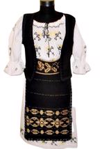 Costum popular banatean format din camasa populara de femei din panza alba de bumbac cusuta manual cu motive traditionale romanesti in culori multicolore, maneca lunga ce se inchide cu un siretel, poale din panza de bbc alba cusuta pe margini cu acelasi model de pe ie, 2 insertii de dantela alba, 2 catrinte(fote) fata/spate , cea din fata de 1m lungime si cea din spate de 30 cm lungime la care atasati ciucuri lungi de 70 cm,din stofa neagra brodate cu motive florale si pe margini dantela neagra ,brau din acelasi material si vesta cu acelasi model de pe catrinte si acelasi material.