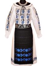 ie traditional romaneasca din panza de bumbac brodata manual cu motive florale rosu inchis si deschis, galben, verde deschis si inchis, cu maneca lunga, elastic si insertie de dantela alba, poale(fusta) alba din panza de bumbac cu insertie de dantela alba pe margini, 2 catrinte(fote) de 70 cm lungime , fata-spate, tesute in razboi din lana neagra si trandafiri cu matase neagra , iar de jur imprejur insertie de dantela neagra si brau din acelasi material cu trandafiri de matase rosie.