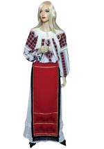 Costum popular de femei format din ie traditional romaneasca din panza alba de bumbac cu in cusuta manual cu motive populare maro si negru, maneca lunga cu insertie de dantela alba din bumbac pe margini si elastic, , poale/fusta alba din panza de bumbac cu in, cusuta pe poale cu acelasi model de pe ie, insertie de dantela alba si 2 catrinte(fote) fata/spate de 60 cm lungime tesute in razboi cu lana neagra si matase maro si insertie de dantela neagra pe margini si brau din acelasi material.
