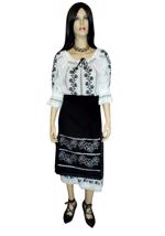 Costum popular de femei format din ie traditional romaneasca din panza alba de bumbac cu in cusuta manual cu motive populare rosu si negru, maneca lunga cu insertie de dantela alba din bumbac pe margini si elastic, , poale/fusta alba din panza de bumbac cu in, cusuta pe poale cu acelasi model de pe ie, insertie de dantela alba si 2 catrinte(fote) fata/spate de 70 cm lungime din stofa rosie brodata cu negru si insertie de dantela neagra pe margini si brau din acelasi material.
