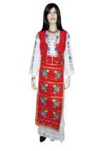 Costum popular de femei format din ie traditional romaneasca din panza alba de bumbac cu in cusuta manual cu motive populare cu mov, maneca lunga cu insertie de dantela alba din bumbac pe margini si elastic, , poale/fusta alba din panza de bumbac cu in, cusuta pe poale cu acelasi model de pe ie, insertie de dantela alba si 2 catrinte(fote) fata/spate de 60 cm lungime tesute in razboi manual din lana neagra si trandafiri din matase alba si insertie de dantela neagra pe margini si brau din acelasi material.