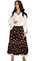 Costum popular romanesc format din camasa populara de femei din panza alba de bumbac cu in cusuta manual cu motive traditionale romanesti negru, maneca lunga cu insertie de dantela alba din bumbac pe margini, poala alba din panza de bbc cu in cu 2 insertii de dantela alba de bumbac, 2 catrinte ( fote) fata/spate de 100 cm lungime, tesute in razboi pe fir negru de lana cu model geometric din matase alba si insertie de dantela neagra pe margini si brau din acelasi material.