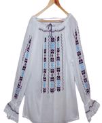 Costum traditional de femeie format din camasa populara romaneasca din panza alba de bumbac brodata manual cu trandafiri portocalii si negru si cu insertie de dantela alba la maneci, poale (fusta) alba din panza de bumbac cu insertie de dantela alba pe poale, 2 catrinte(fote) tesute in razboi cu matase alba si brau din acelasi material.