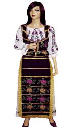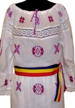 Ie traditional romaneasca din panza de bumbac brodata manual cu motive populare maro si negru, cu maneca lunga, elastic si insertie de dantela alba.