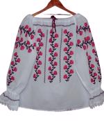 Ie din panza de bumbac alba, cusuta manual cu fir de pna rosu si negru.