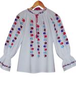 Ie din panza de bumbac alba, cusuta manual cu fir de pna bleu si negru.