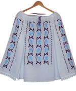 Ie din panza de bumbac alba, cusuta manual cu fir pna rosu si negru.