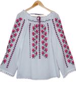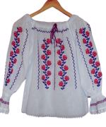 Camasa din panza de bumbac subtire( albinita) alba, cusuta manual cu fir rosu si negru.