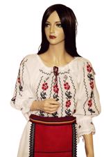 Camasa populara de femei din panza alba de bumbac cusuta manual cu motive traditionale romanesti cu rosu si negru, maneca 3/4 cu insertie de dantela alba din bumbac pe margini.