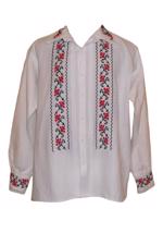 Costum tradițional de botez pentru fetițe, cusut manual cu fir roșu, galben, albastru, maro și verde, într-o combinație de culori vibrante ce aduc bucurie și autenticitate fiecărui detaliu.