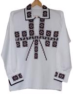 ie fetita traditional romaneasca din panza de bumbac brodata manual cu motive florale rosu si negru, cu maneca lunga ce se termina cu insertie de dantela alba si elastic.